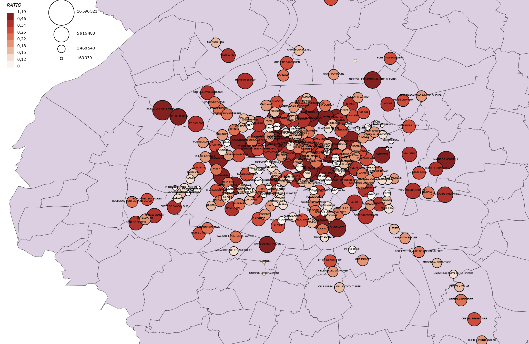 J’ai testé plusieurs approches de représentation pour ce projet. Et en premier lieu la carte dite de stock avec des aires circulaires, proportionnelles au volume d’entrées en station. Mais le résultat était particulièrement illisible. Les aires représentant des stations très fréquentées recouvraient totalement les autres stations et l’ajout de libellés n’arrangeaient pas la clarté de l’ensemble.