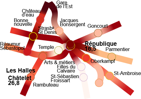 309 stations et 1,3 milliards d’entrées sont traitées en un seul visuel.